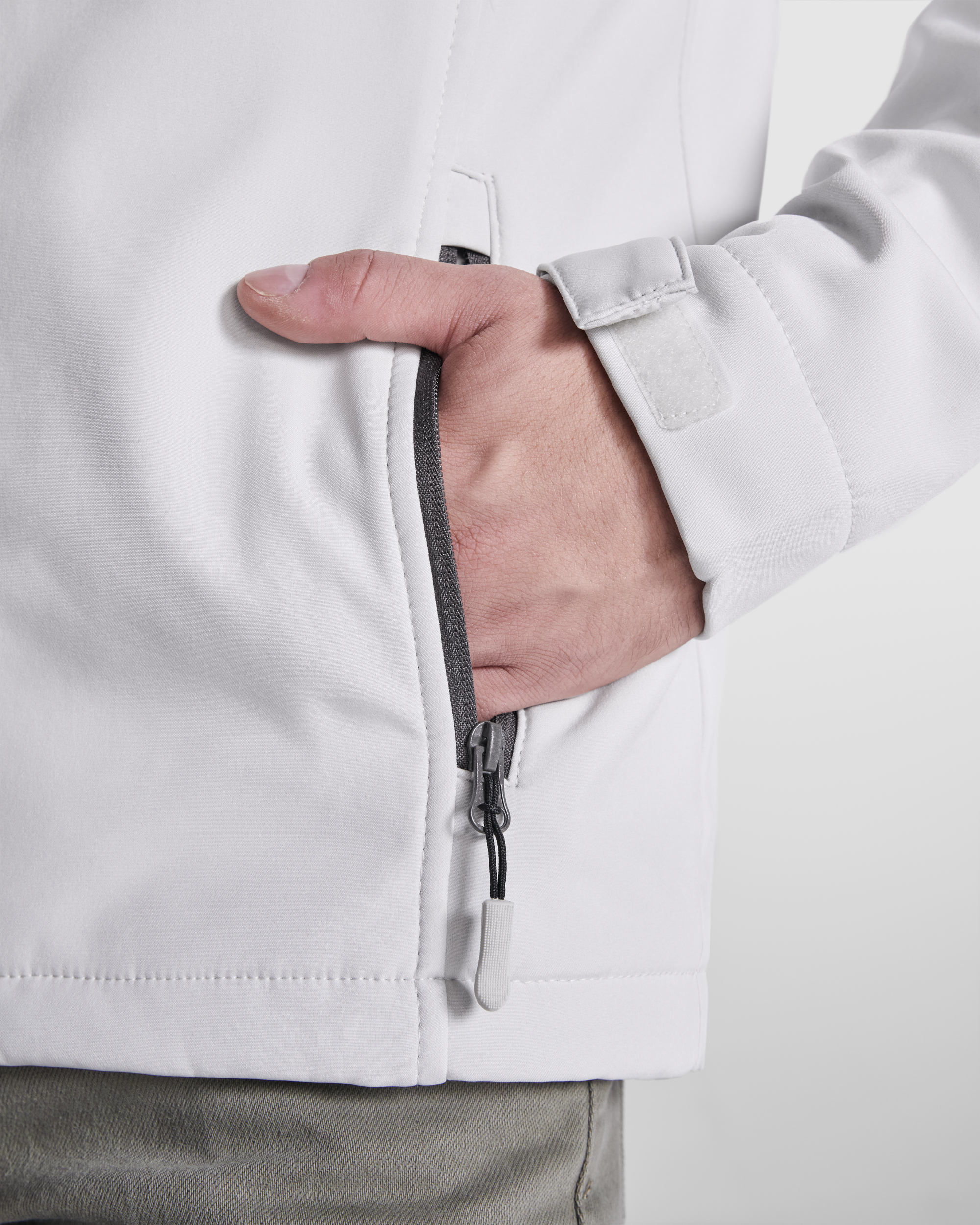 Softshell compuesto por 2 capas, con cremallera invertida efecto sellado, con protector de barbilla combinada y tirador. Corte en pecho (sólo modelo masculino). Cuenta con tres bolsillos exteriores con cremallera combinada con tirador. Ajustadores en puños con velcro. Bajo con cordón elástico y topes.