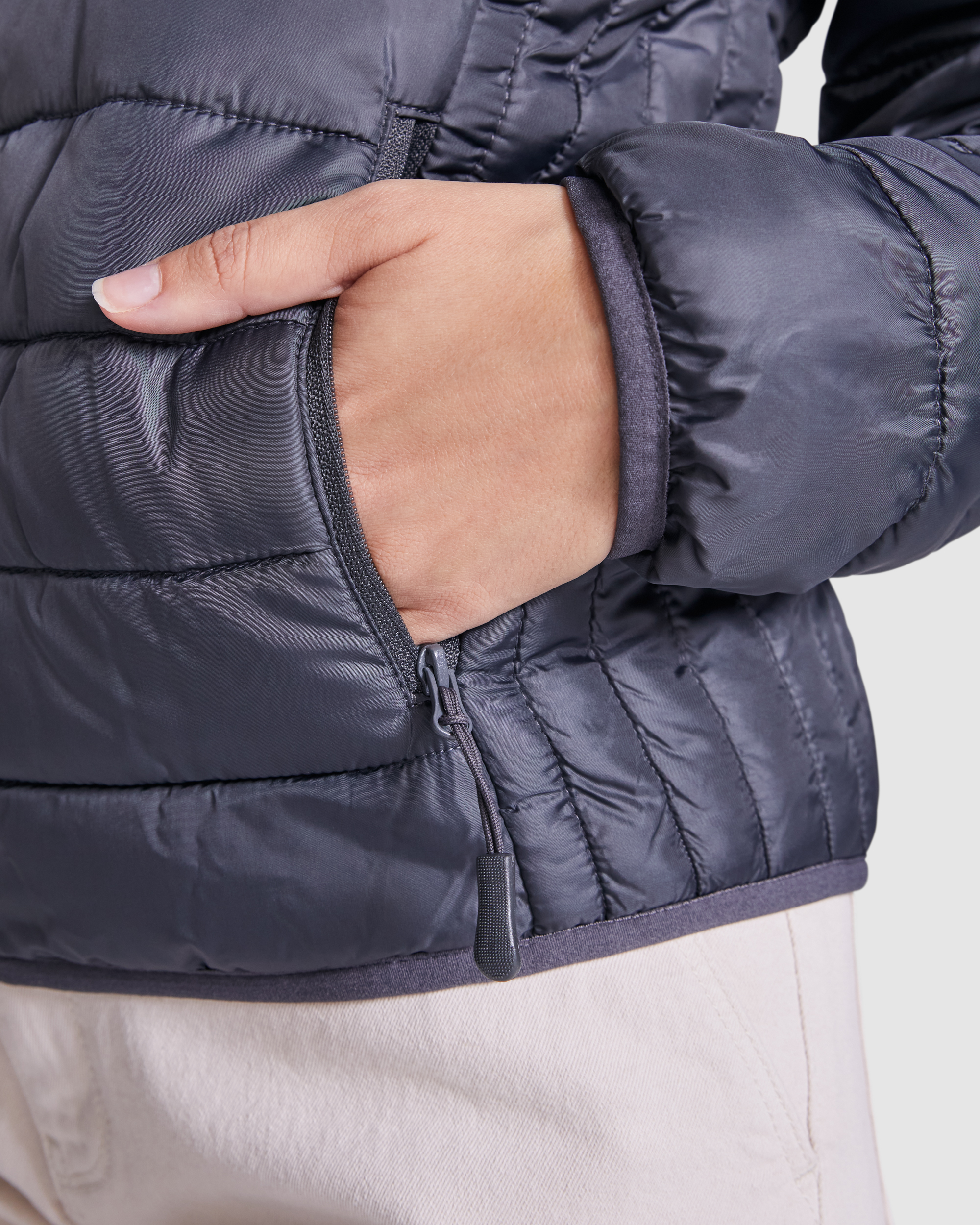 Chaqueta de mujer acolchada con relleno tacto pluma. ·Cremalleras invertidas a tono con protector de barbilla y tirador. ·Dos bolsillos frontales con cremalleras. ·Ribete elástico a tono en puños y bajo. ·Forro interior a contraste. ·Prenda ligera y plegable.