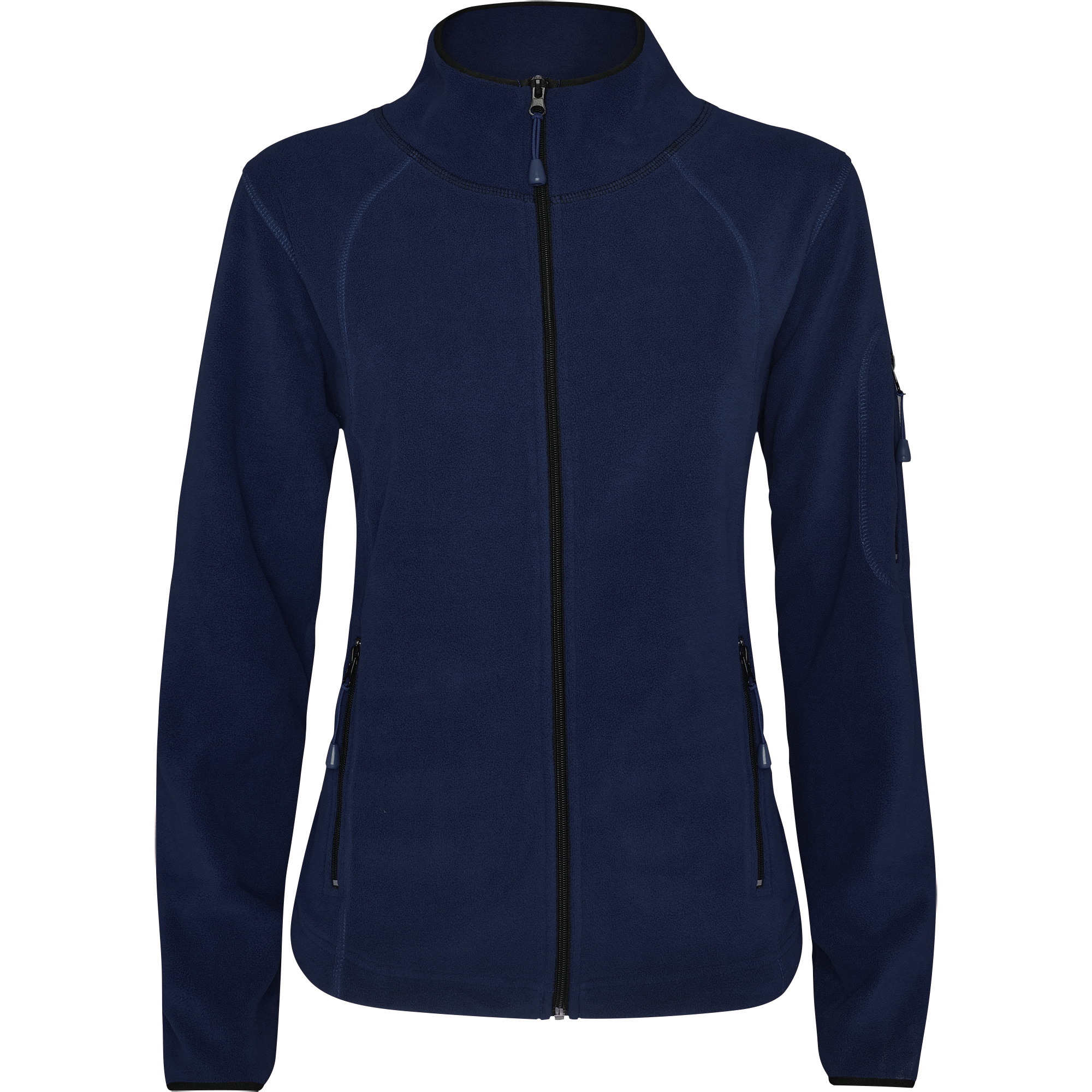 Sudadera polar para deporte al aire libre, con cuello alto y manga larga con ribetes en contraste. Bolsillo con cremallera en manga izquierda y cremallera central, ambas en contraste. Costuras en lateral y pecho. Codera en el mismo tejido.