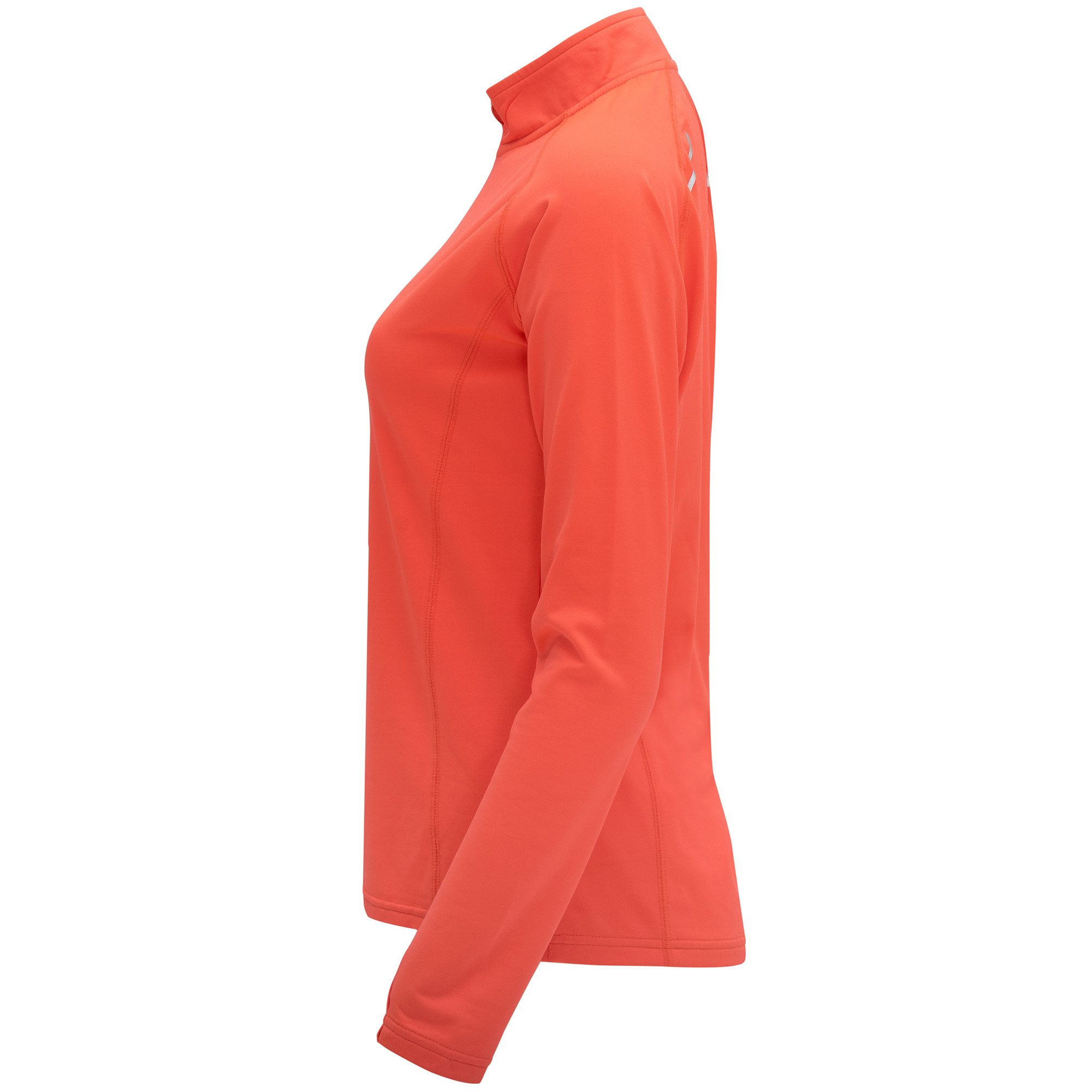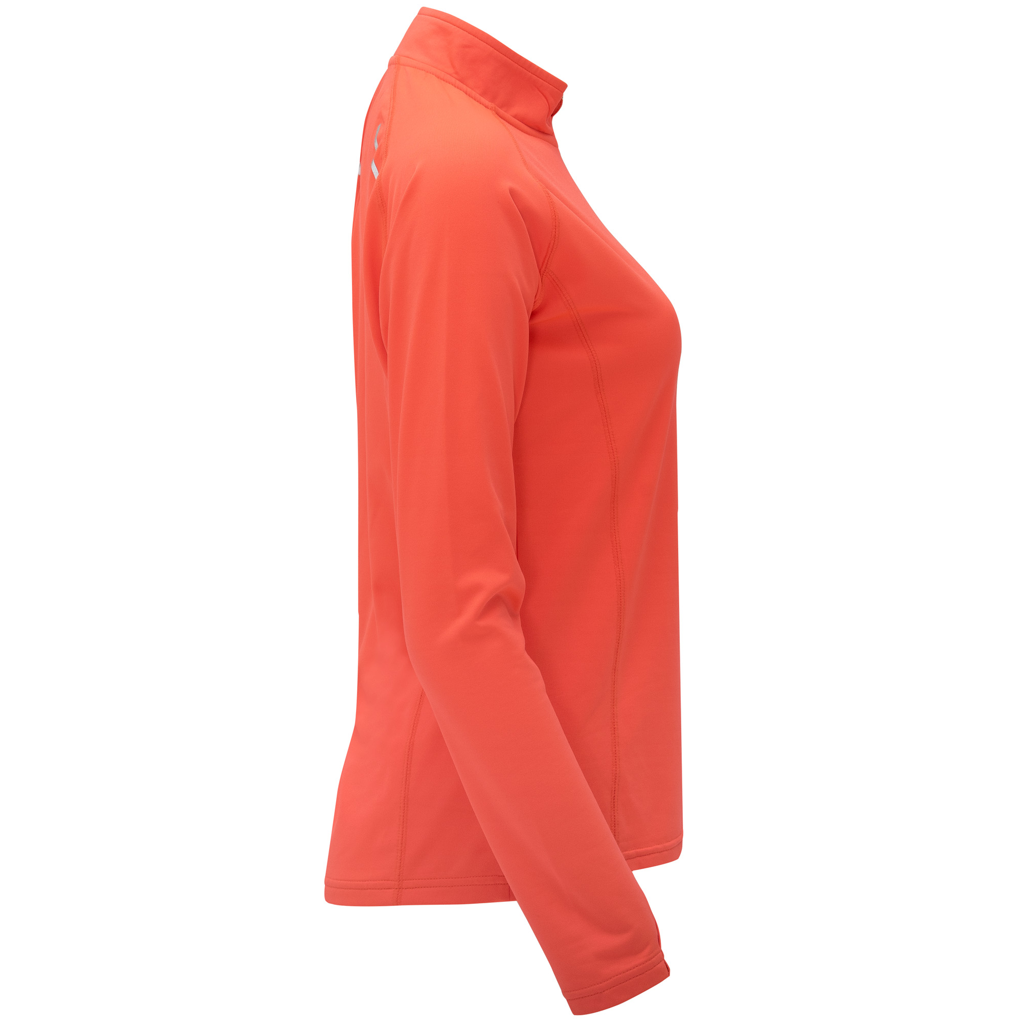 Sudadera técnica de manga larga ranglán para mujer con interior perchado. Cubrecosturas de refuerzo a contraste en el interior del cuello. Media cremallera invertida a tono con detalle reflectante. Puños con apertura para pulgar. El patronaje de la espalda es ligeramente más largo que el delantero. Detalles reflectantes en las espalda.