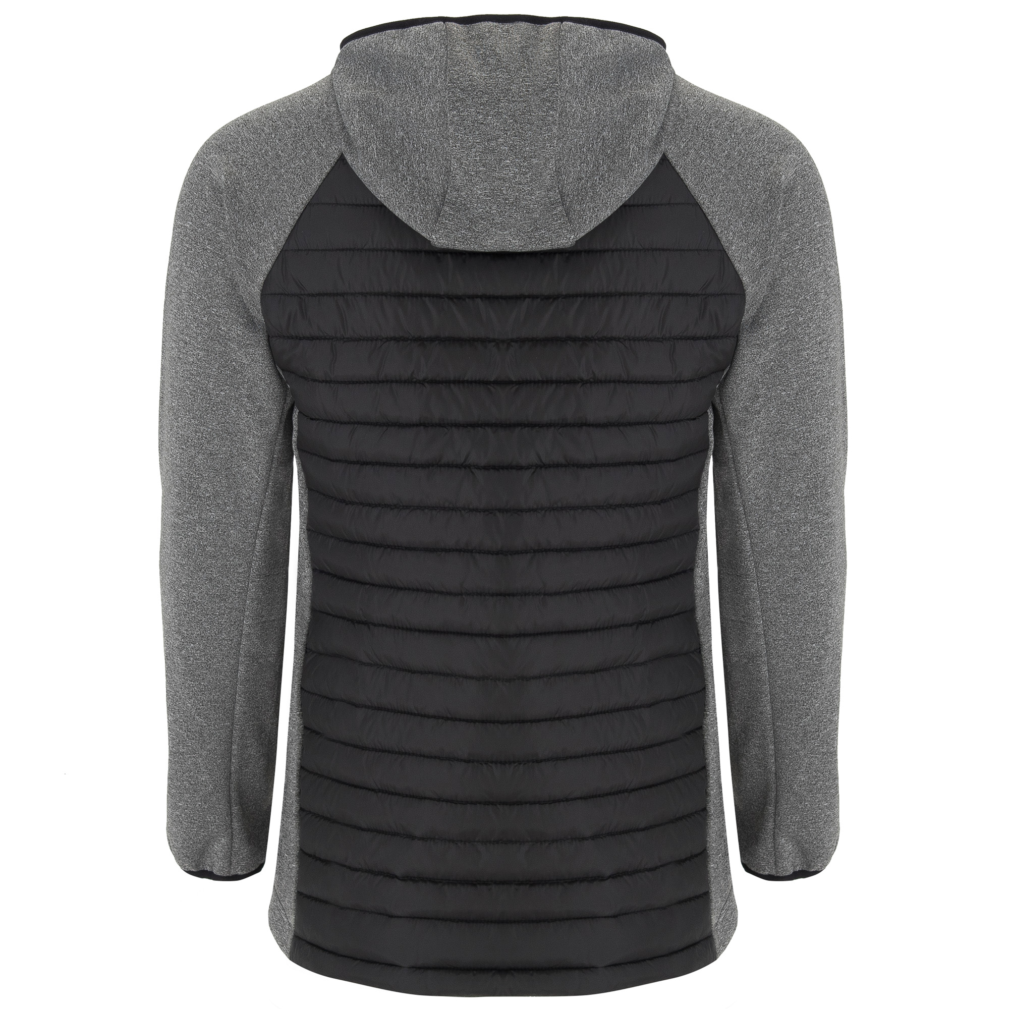 Chaqueta de hombre combinada en dos tejidos: Capucha fija ajustada. Manga estilo ranglán. Tejido softshell en mangas, paneles laterales y capucha, y tejido acolchado tacto pluma en frontal y espalda. Cremallera invertida a tono con protector de barbilla y tirador. Dos bolsillos frontales con cremalleras. Ribete elástico a tono en cuello, puños y bajo.