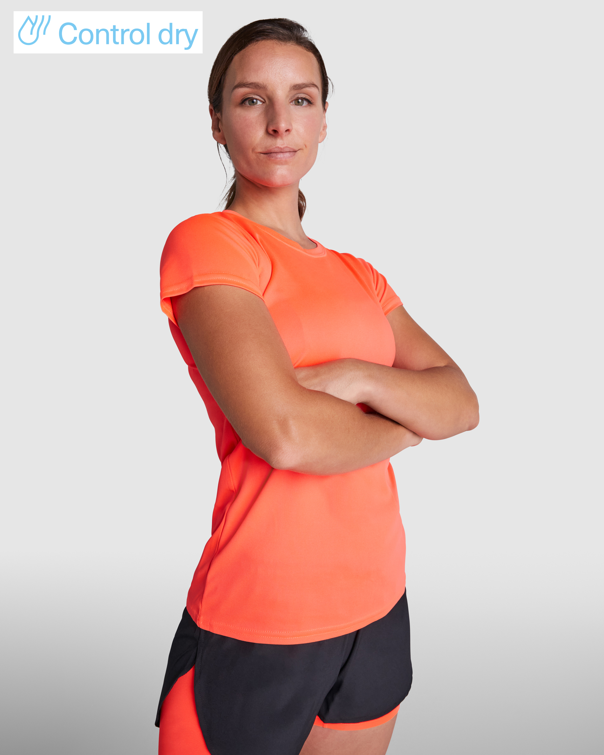 Camiseta técnica de manga corta. Cuello redondo con cubrecosturas. Corte entallado.