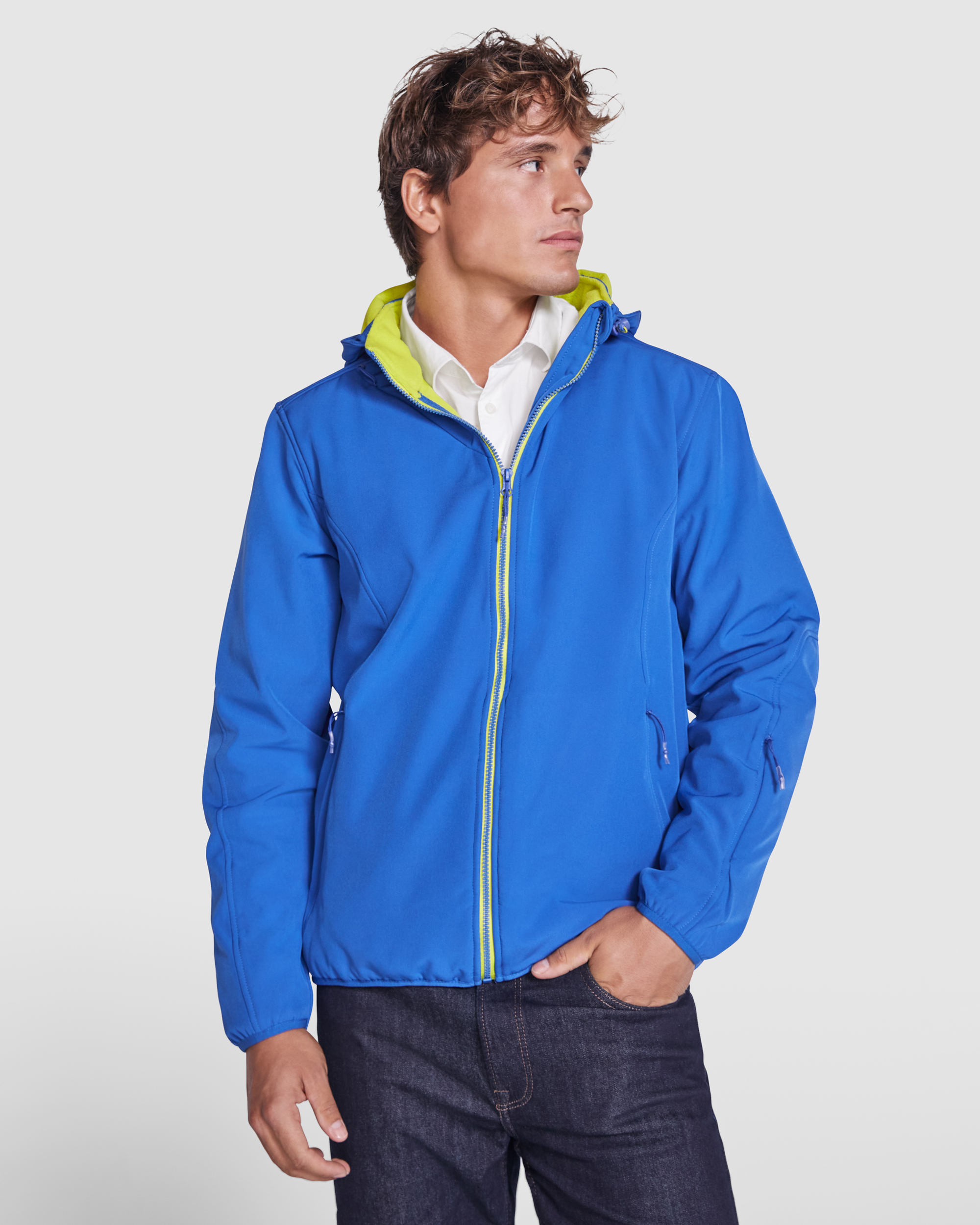 Softshell compuesto de 2 capas con corte deportivo. Cremallera central a contraste con protector de barbilla y tirador. Forro interior en tejido micropolar a contraste. Cuenta con bolsillo exterior en pecho derecho con cremallera invisible con forma diagonal, dos bolsillos exteriores laterales con cremallera invisible, y un bolsillo en manga izquierda. Ribete elástico a tono en puños y bajo. Capucha extraible con forro micropolar a constraste.
