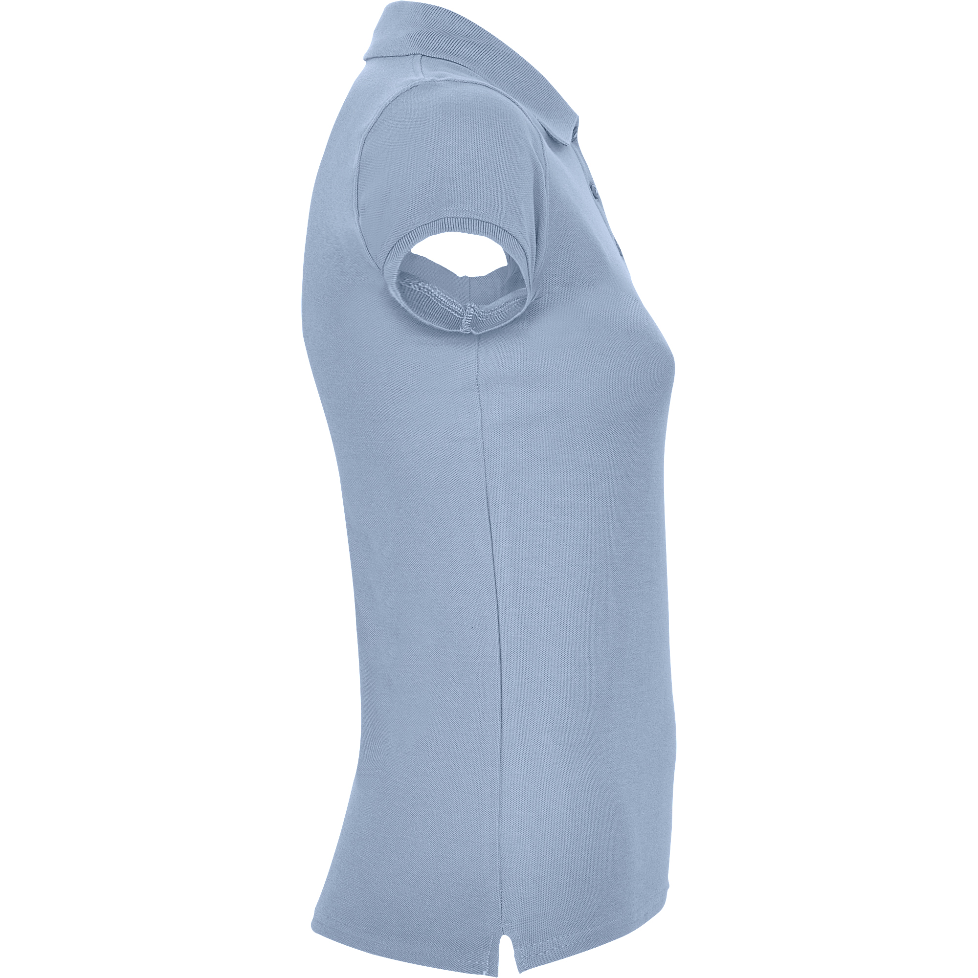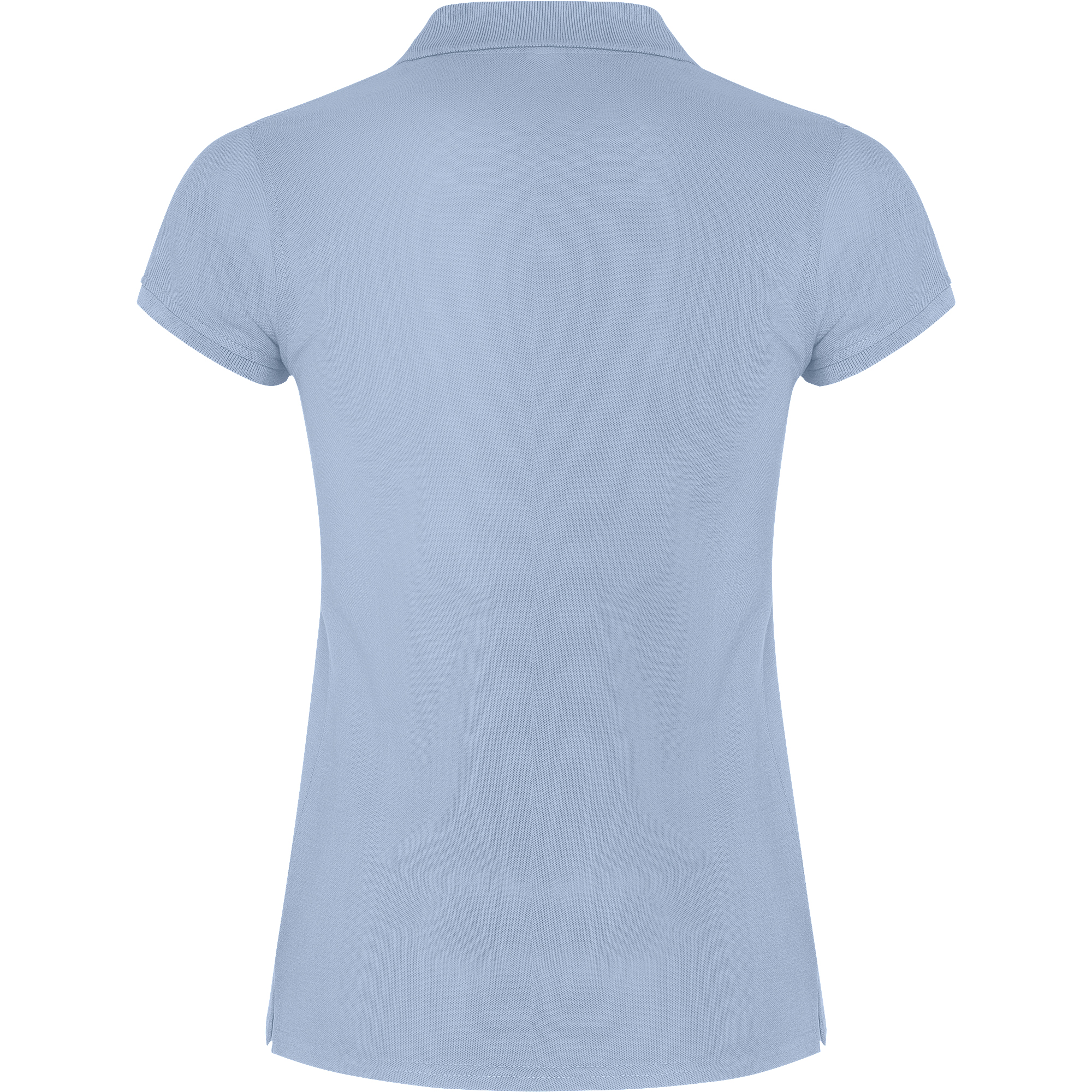 Polo de mujer de manga corta. Cubrecosturas reforzado en el interior del cuello. Cuello y ribete de manga acanalado. Costuras laterales y corte ajustado. Tapeta fina con tres botones. Aperturas en los laterales del bajo.