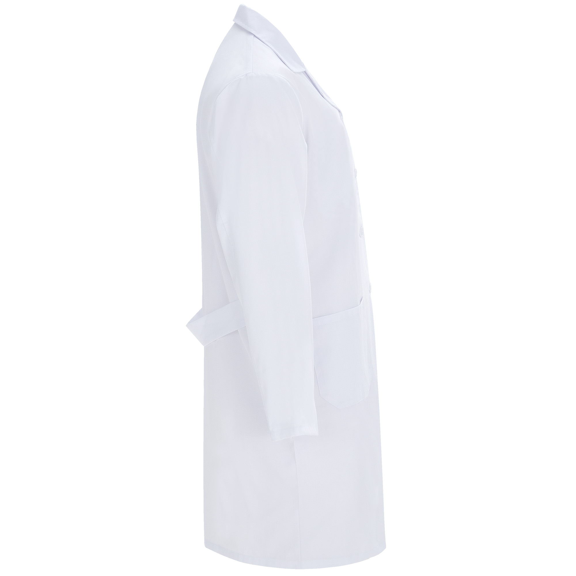 Bata de servicios de manga larga. · Cuello con solapa. · Apertura central con 5 botones a tono. · Un bolsillo en pecho y dos laterales. · Cinturilla trasera.