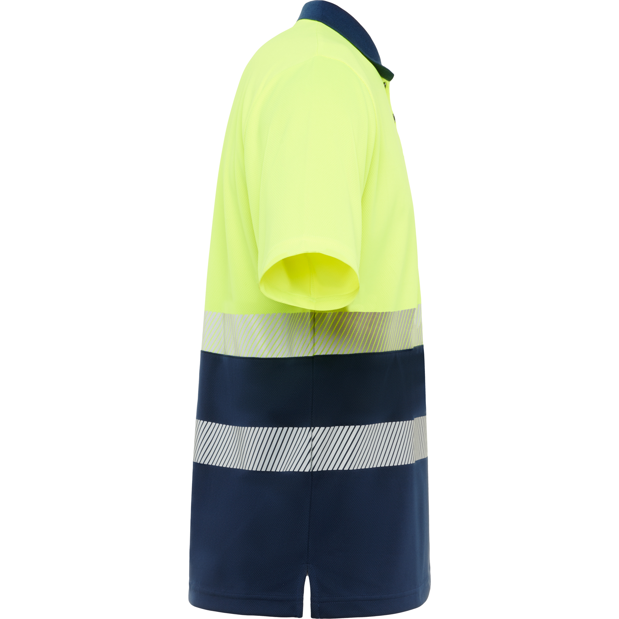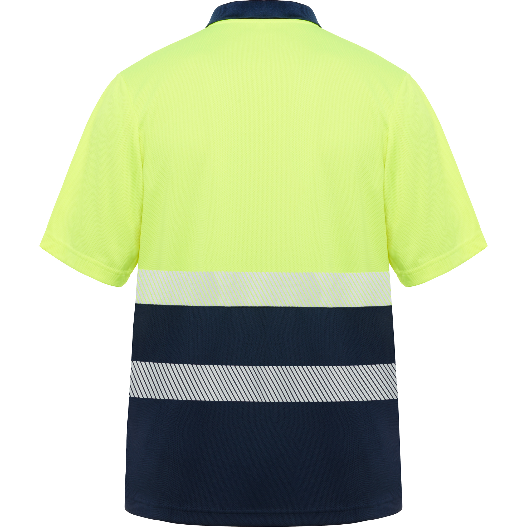 Polo técnico de alta visibilidad en manga corta. · Cuello en punto canalé 1×1 · Dos cintas reflectantes segmentadas en pecho y espalda. · Tapeta con 3 botones a contraste. · Tejido anti enganches y fácil secado.