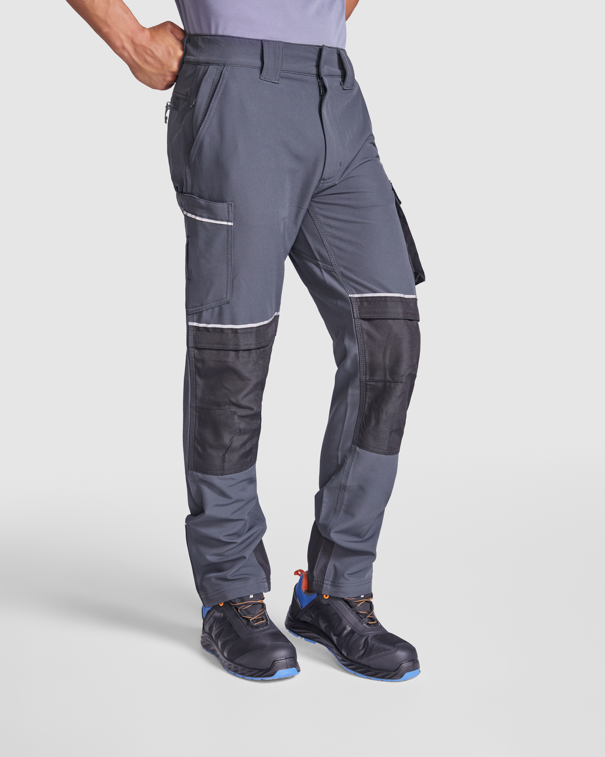 Pantalón laboral stretch multibolsillos. · Cinturilla con dos trabillas delanteras y tres traseras con la trabilla central de ancho especial. · Cierre con cremallera y botón a presión gomado. · Dos bolsillos delanteros de corte clásico, uno de ellos con bolsillo lateral y cremallera. · Bolsillo cargo en lateral izquierdo con tapeta, cinta reflectante y cierre de velcro. · Bolsillo plastrón en lateral derecho con cinta reflectante y cierre de velcro. · Bolsillo para rodilleras con tapeta fija, cinta reflectante y cierre de velcro. · Trabilla en lado izquierdo para herramientas. · Canesú trasero con dos bolsillos con vivos y cremalleras invertidas. · Bajo con resfuerzo y cinta refectante en la parte posterior. · Triple costura de refuerzo en lateral y entrepierna con hilo a tono. · Refuerzo en la parte trasera de la entrepierna.