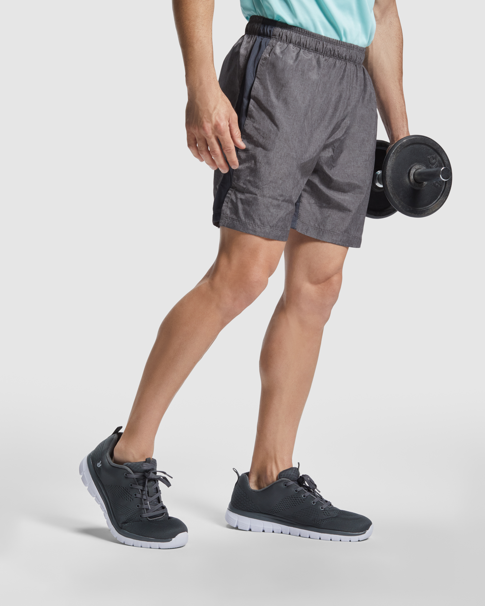 Bermuda con dos tejidos y slip interior. Cinturilla elástica con cordón interior cruzado a contraste. Banda lateral e interior de la pierna en tejido transpirable. Dos bolsillos laterales. Apertura lateral en el bajo con forma asimétrica.