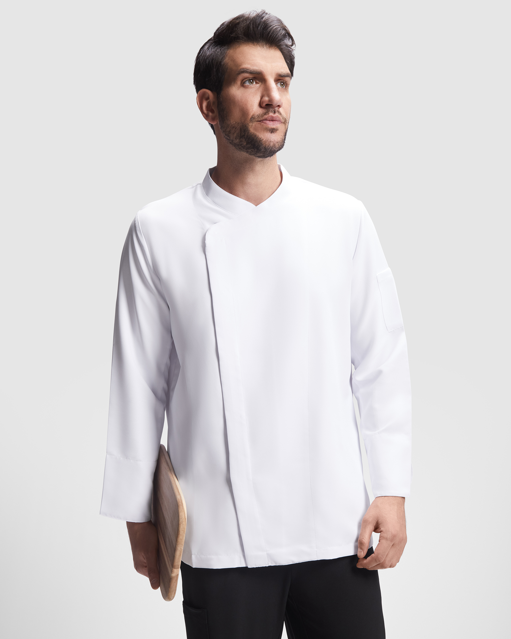 Chaqueta de cocina de manga larga. · Cuello tirilla y manga tipo sastre con dobladillo en puños. · Cierre central cruzado con botones automáticos ocultos. · Espalda en tejido transpirable. · Un bolsillo de parche en manga izquierda.