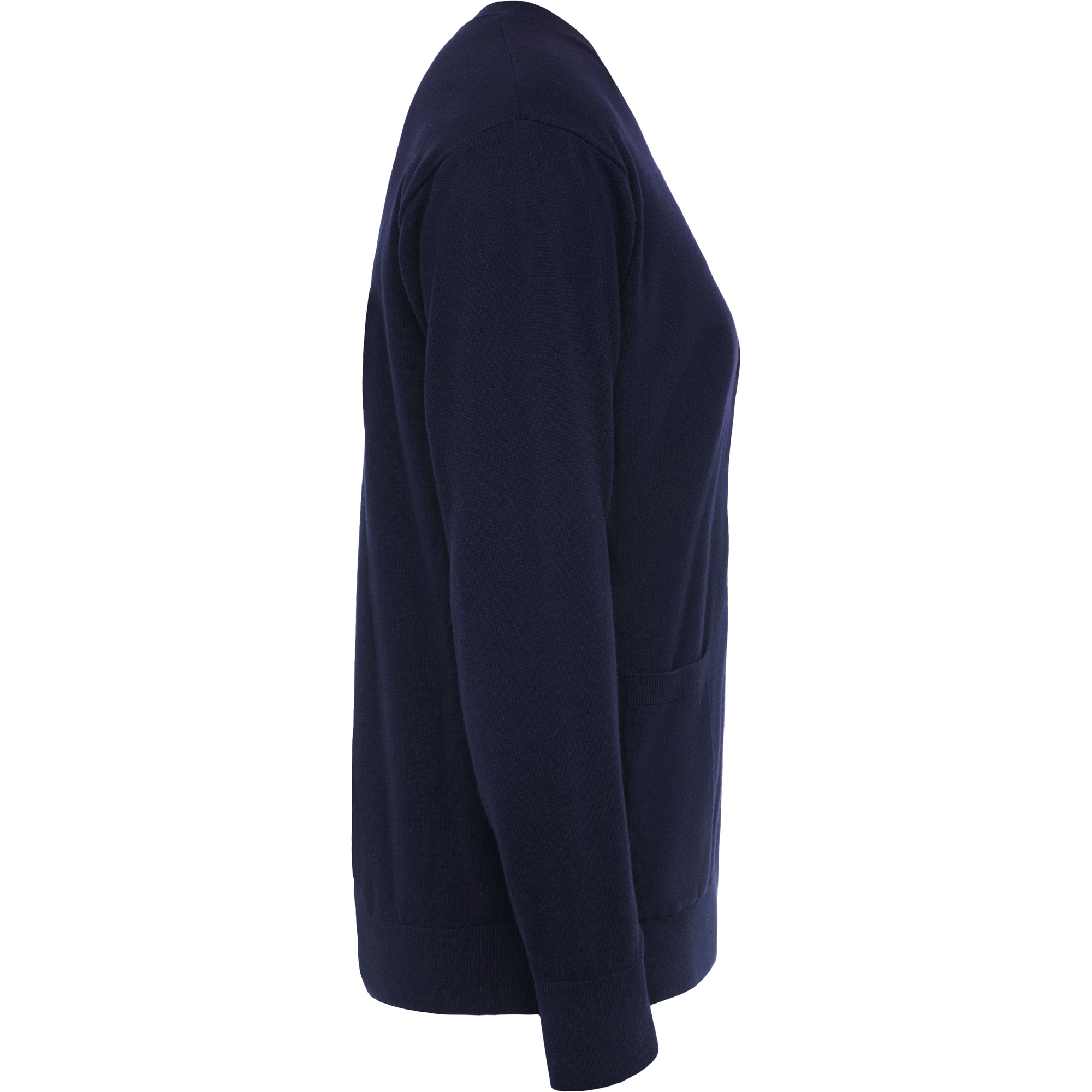 Chaqueta con escote de pico para mujer. · Tejido en punto suave. · Cierre central de cinco botones al tono. · Dos bolsillos de plastón. · Puños y cintura elásticos en punto canalé.