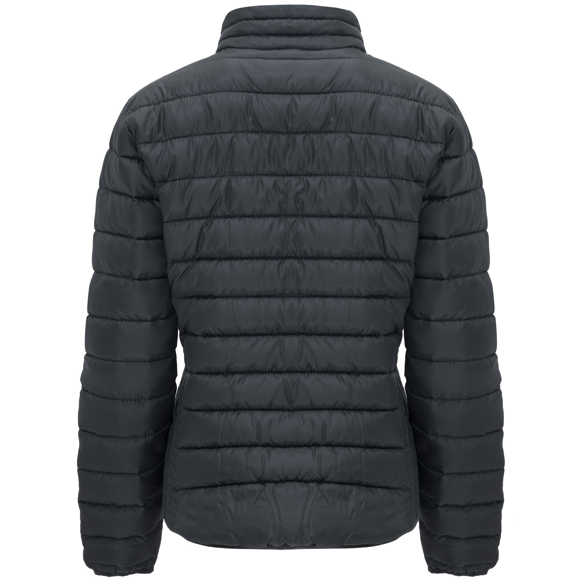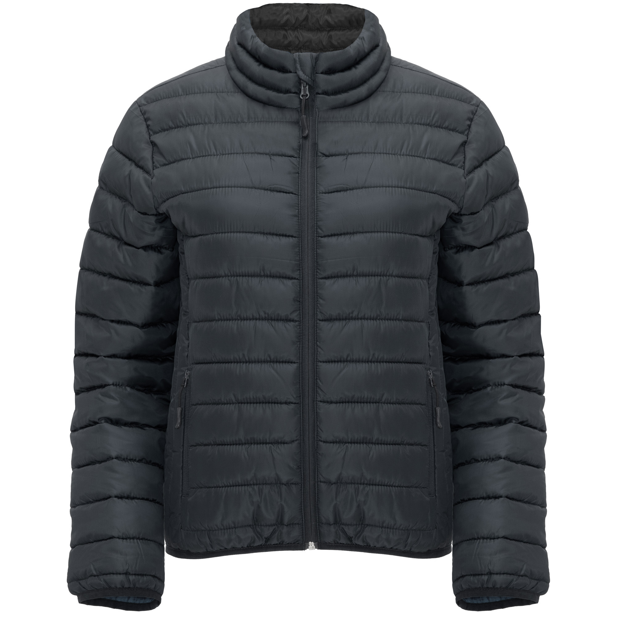 Chaqueta de mujer acolchada con relleno tacto pluma. ·Cremalleras invertidas a tono con protector de barbilla y tirador. ·Dos bolsillos frontales con cremalleras. ·Ribete elástico a tono en puños y bajo. ·Forro interior a contraste. ·Prenda ligera y plegable.