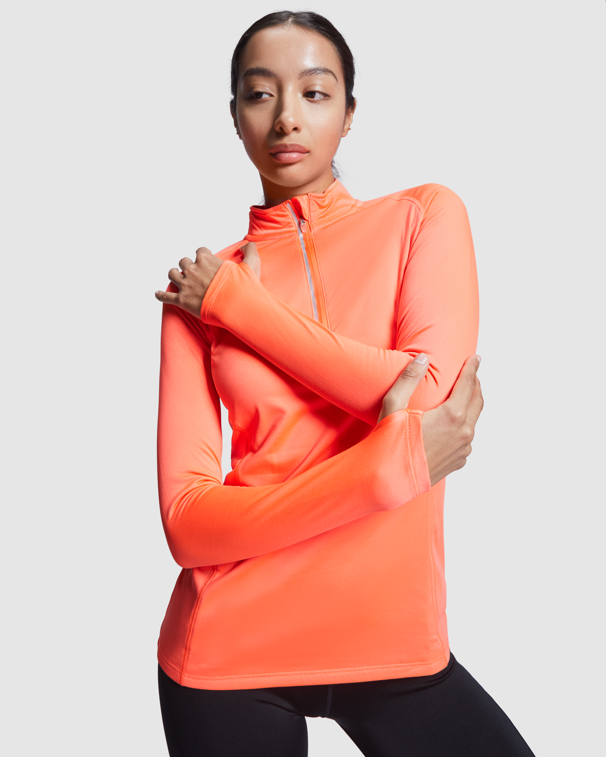 Sudadera técnica de manga larga ranglán para mujer con interior perchado. Cubrecosturas de refuerzo a contraste en el interior del cuello. Media cremallera invertida a tono con detalle reflectante. Puños con apertura para pulgar. El patronaje de la espalda es ligeramente más largo que el delantero. Detalles reflectantes en las espalda.