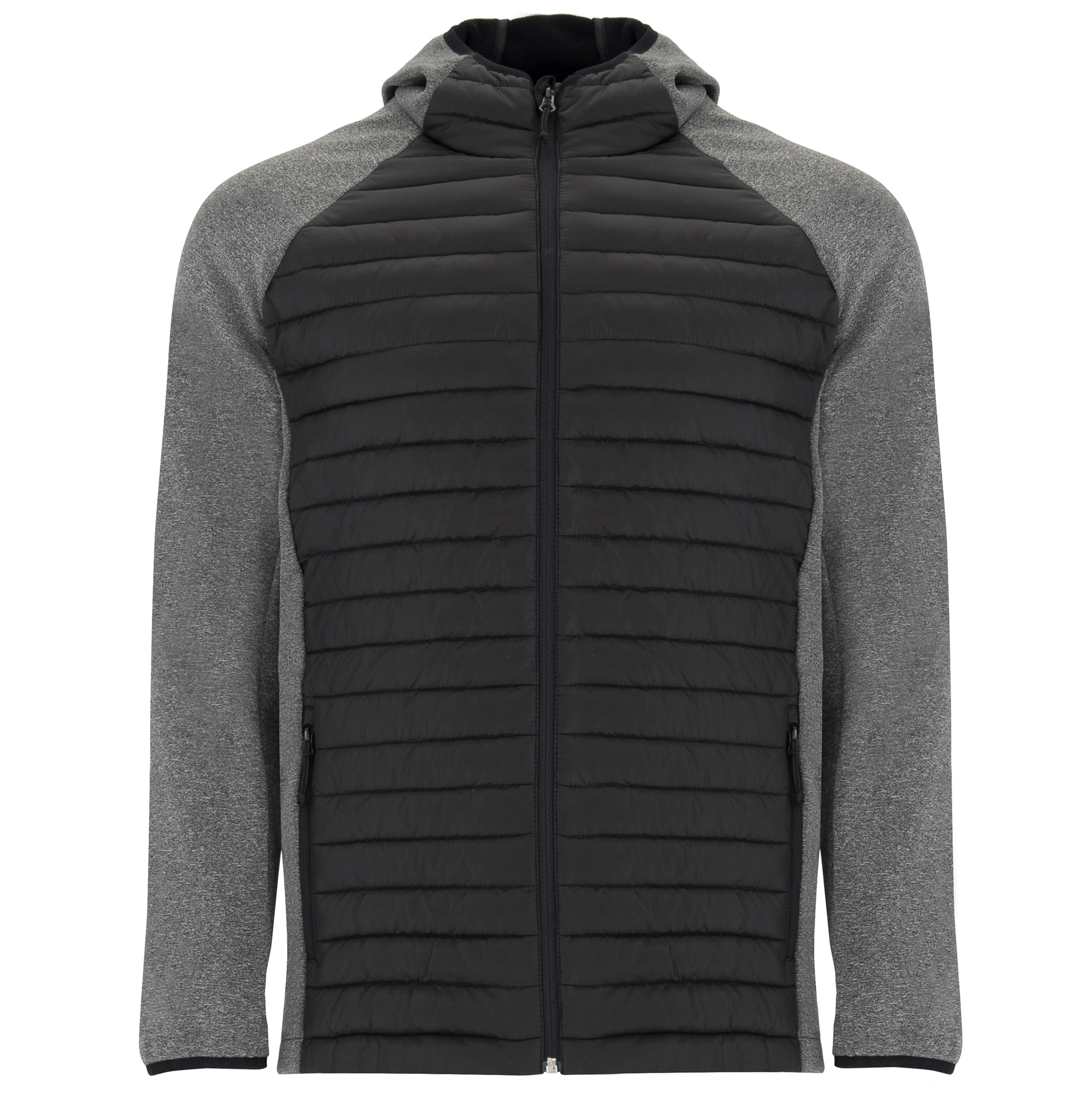 Chaqueta de hombre combinada en dos tejidos: Capucha fija ajustada. Manga estilo ranglán. Tejido softshell en mangas, paneles laterales y capucha, y tejido acolchado tacto pluma en frontal y espalda. Cremallera invertida a tono con protector de barbilla y tirador. Dos bolsillos frontales con cremalleras. Ribete elástico a tono en cuello, puños y bajo.