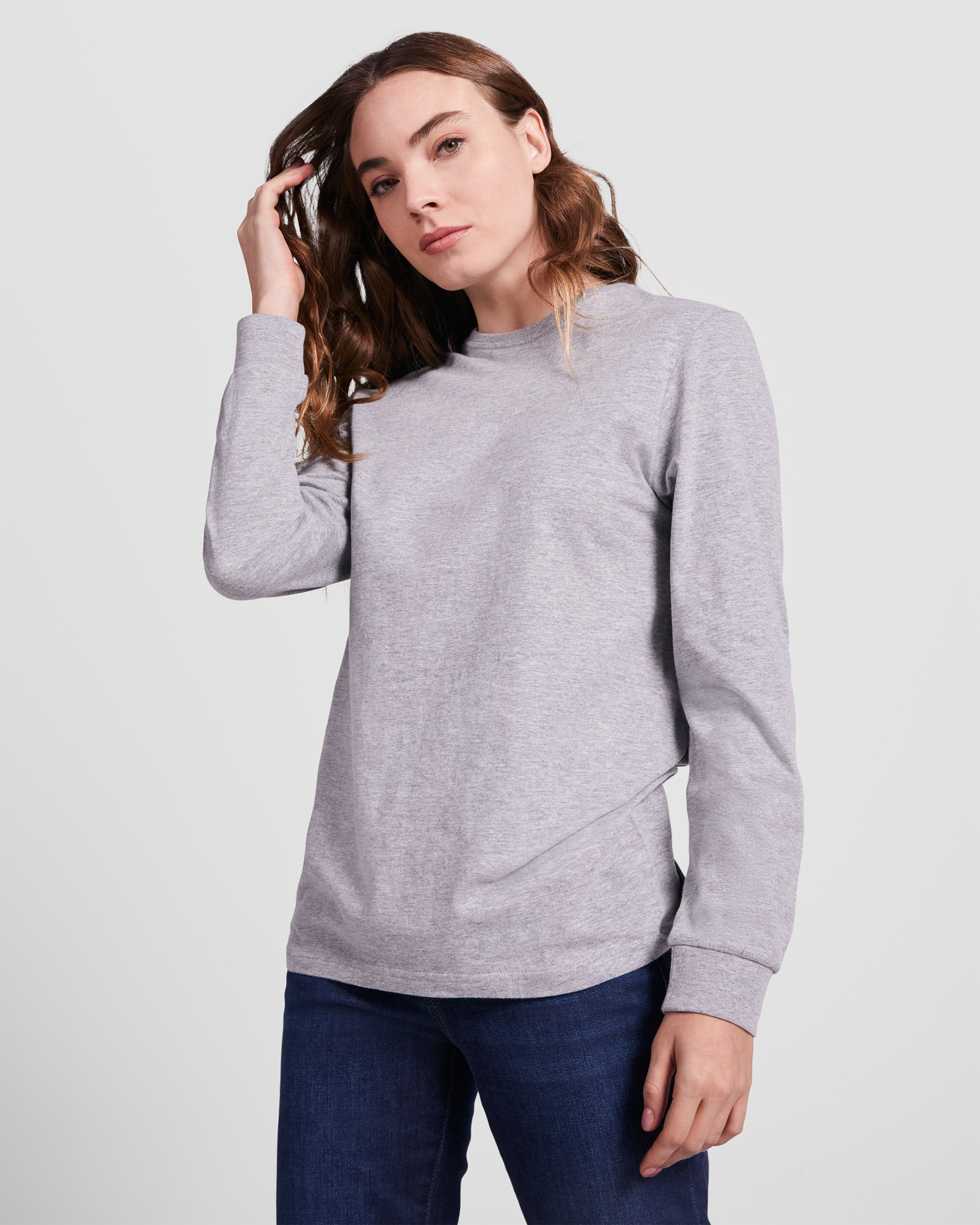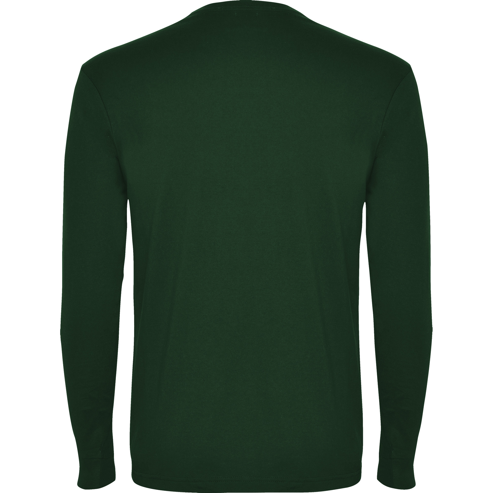 Camiseta de manga larga, tejido tubular, con cuello redondo de 4 capas y puños canalé 1×1. Cubrecosturas reforzado en cuello y hombros.