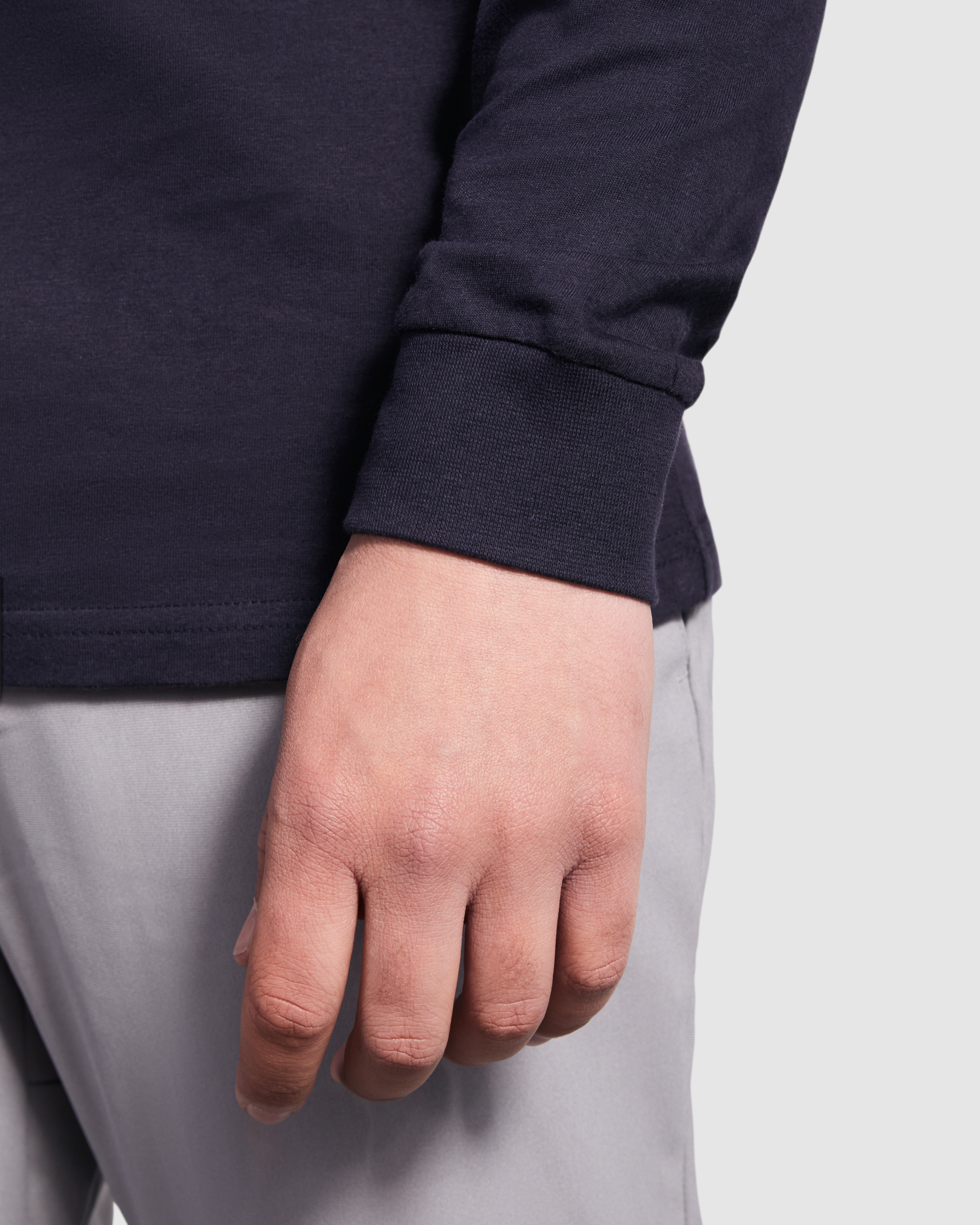 Camiseta de manga larga con cuello redondo y puños en canalé 1×1. Bolsillo en pecho izquierdo. Cubrecosturas reforzado en cuello y hombros.