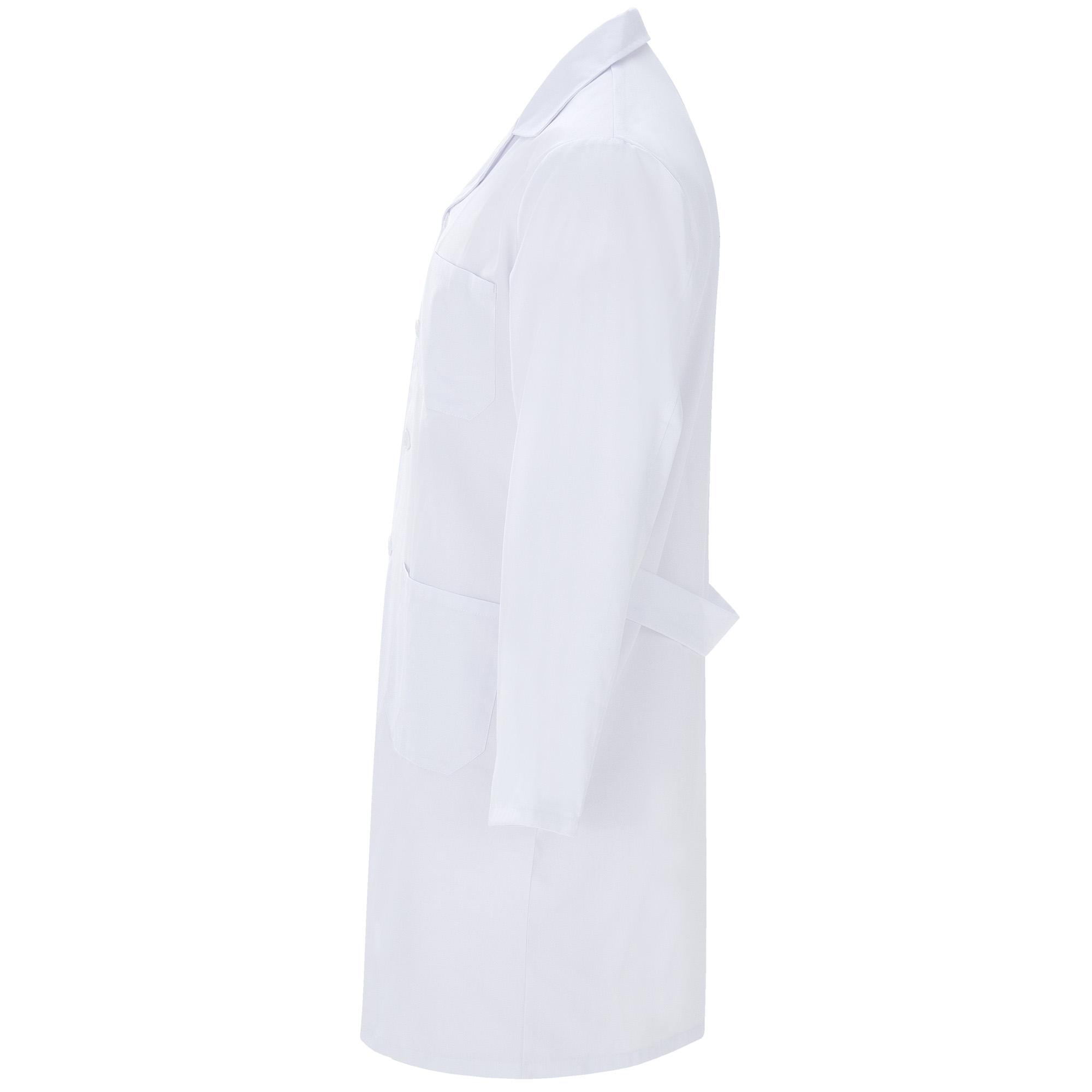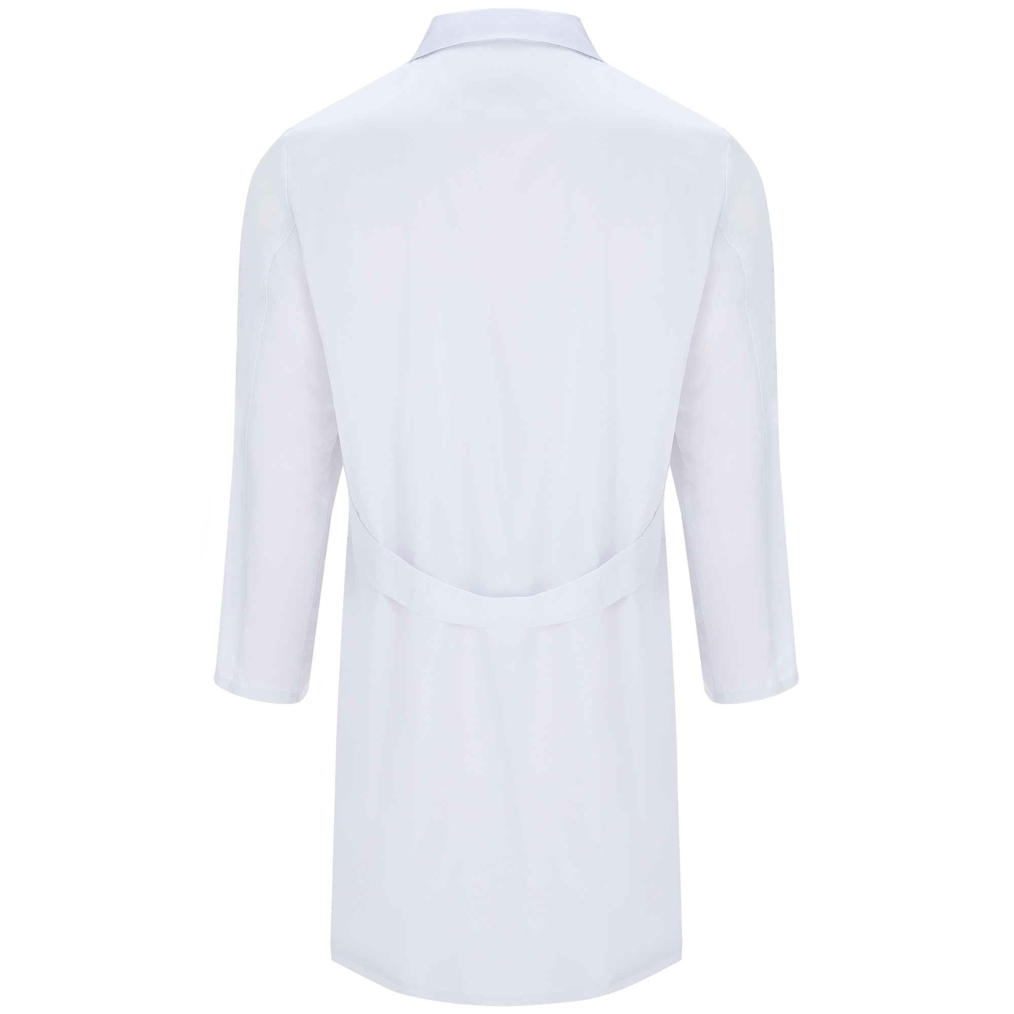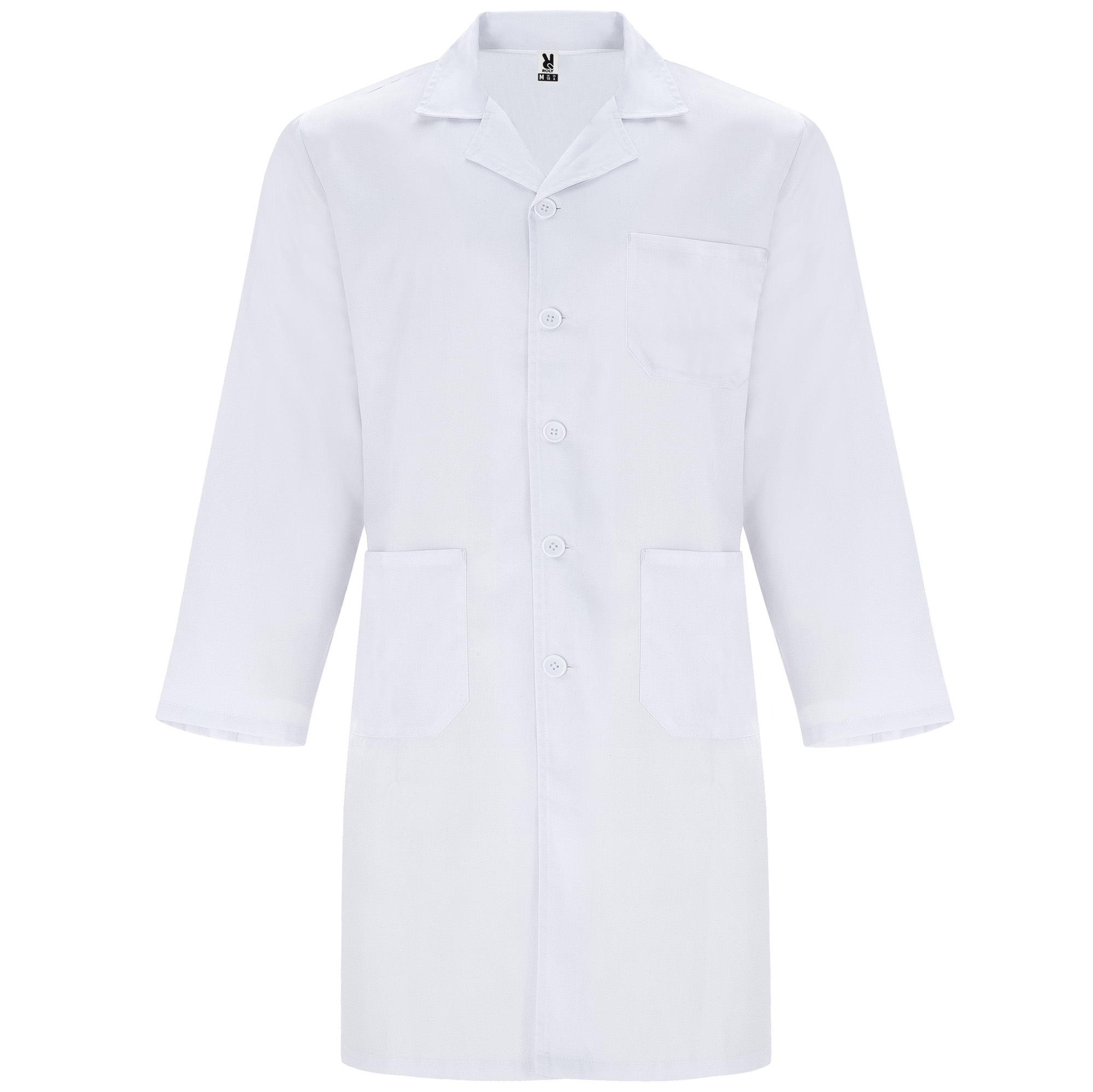 Bata de servicios de manga larga. · Cuello con solapa. · Apertura central con 5 botones a tono. · Un bolsillo en pecho y dos laterales. · Cinturilla trasera.